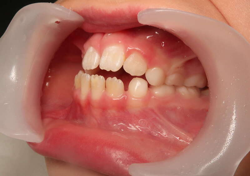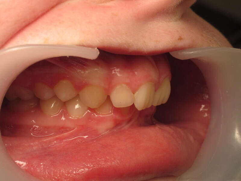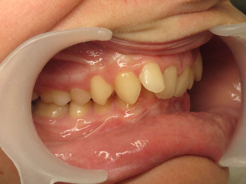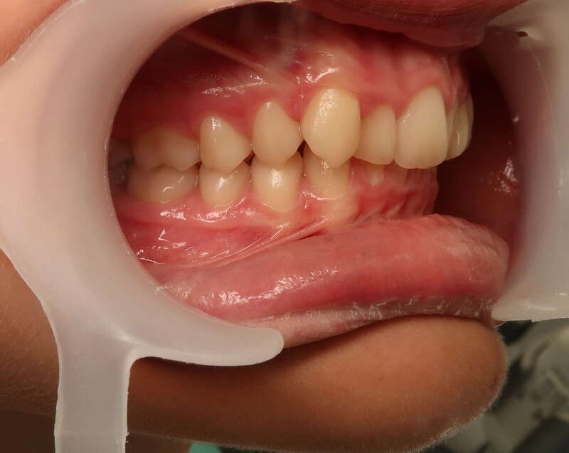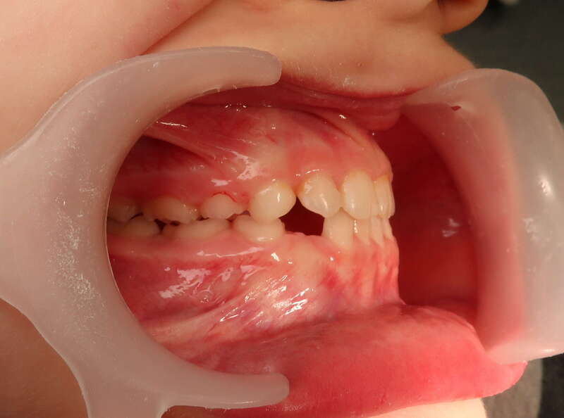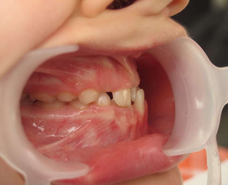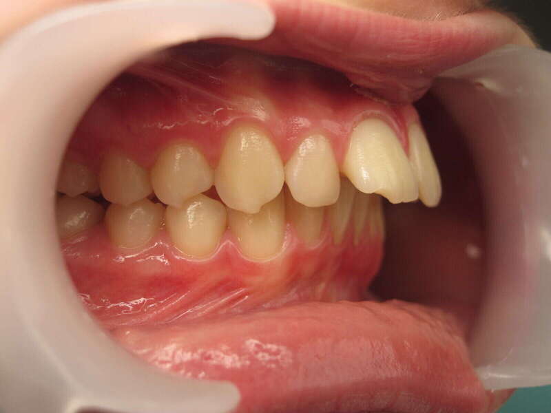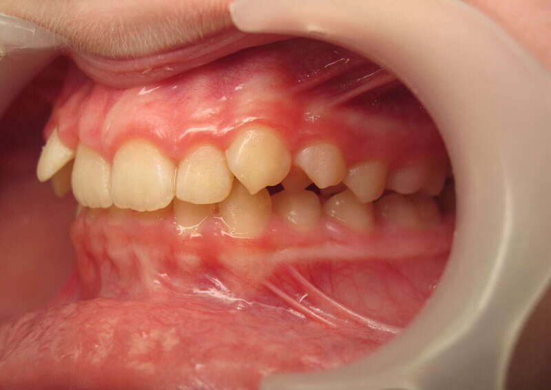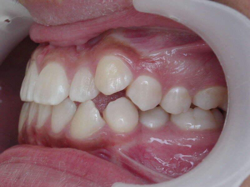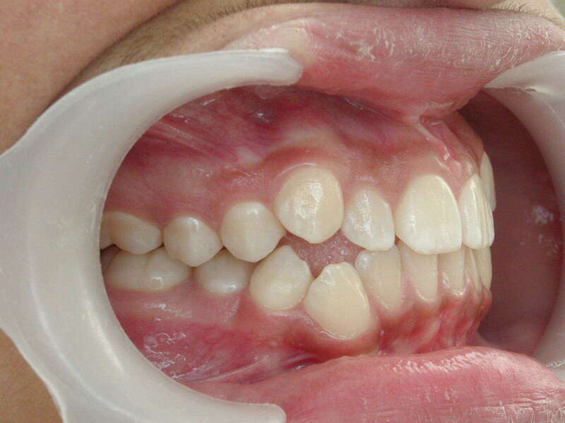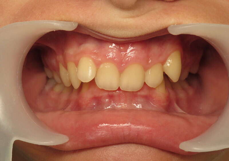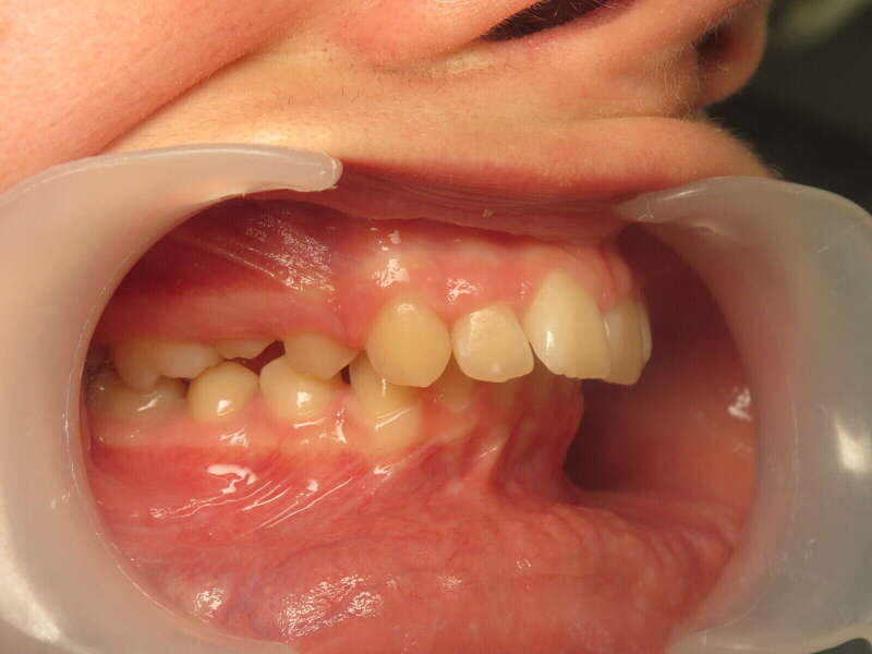 Photos "Avant" : « Proversion incisive extrême avec risque traumatique imminent. L'interposition de la lèvre inférieure sous les dents du haut aggrave le décalage et empêche une fermeture labiale sereine. »