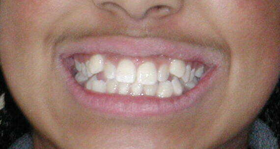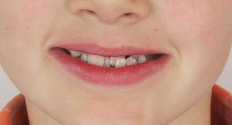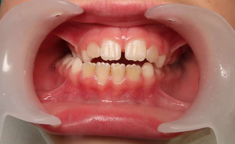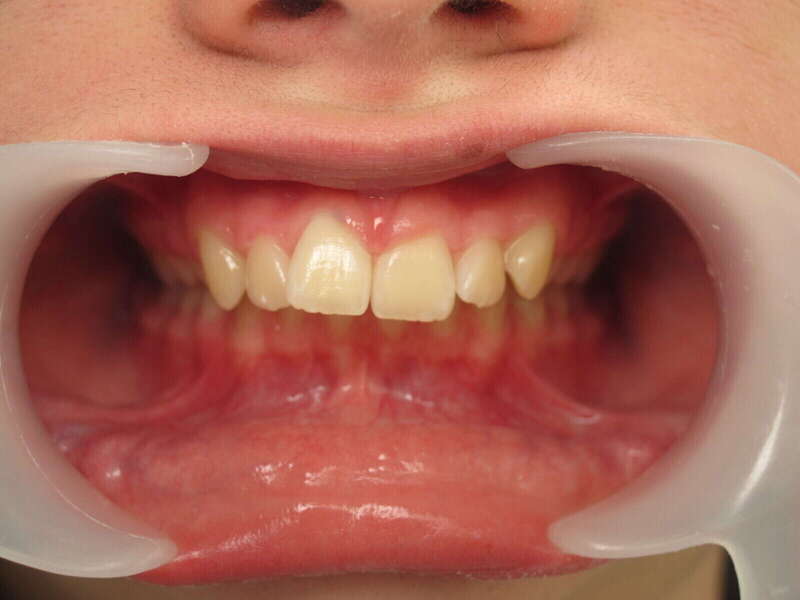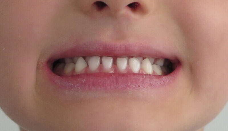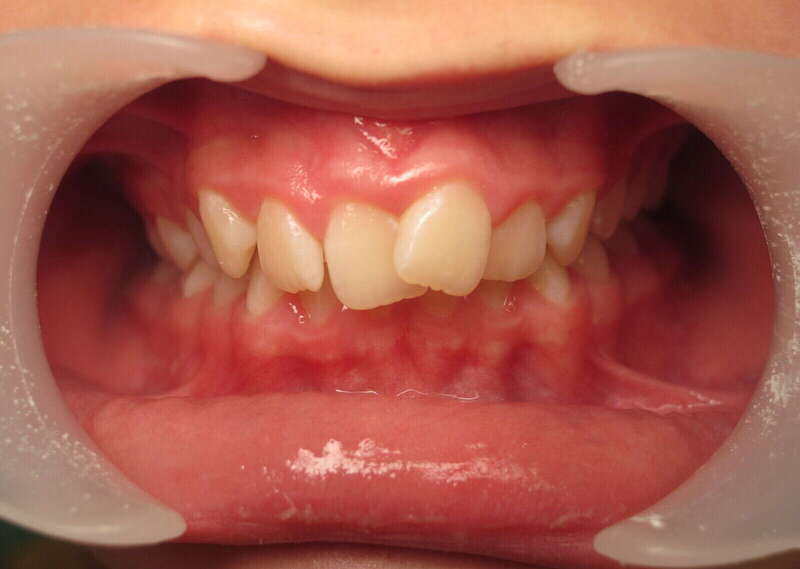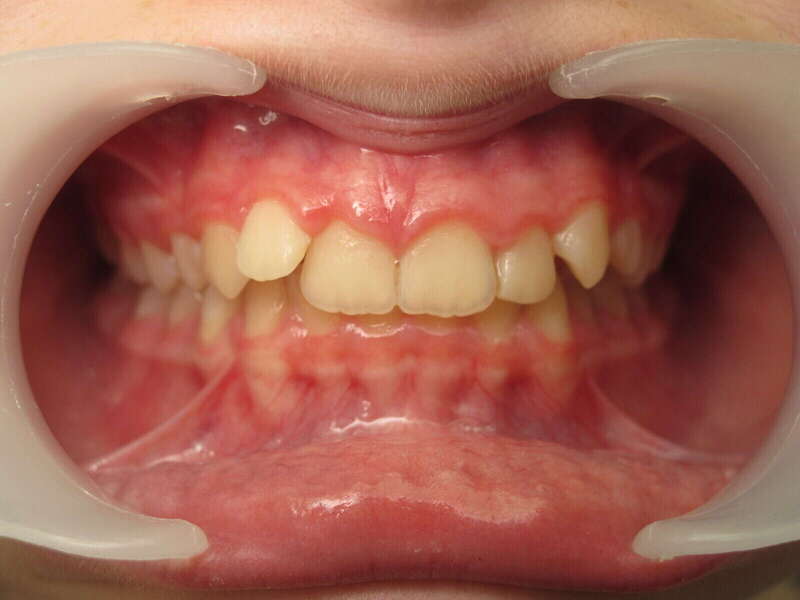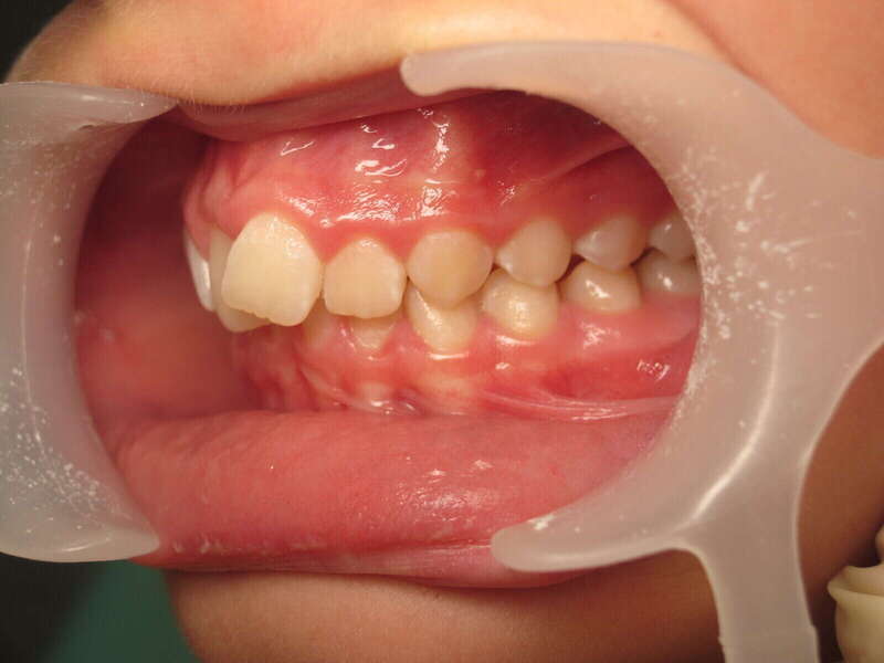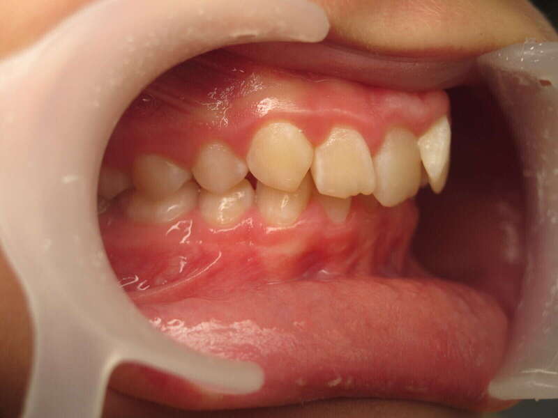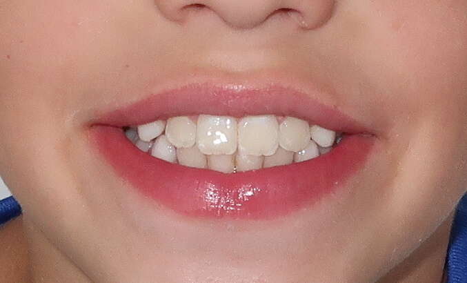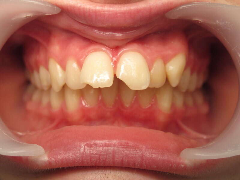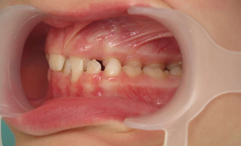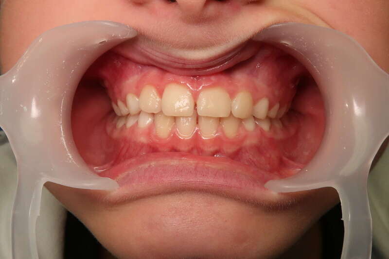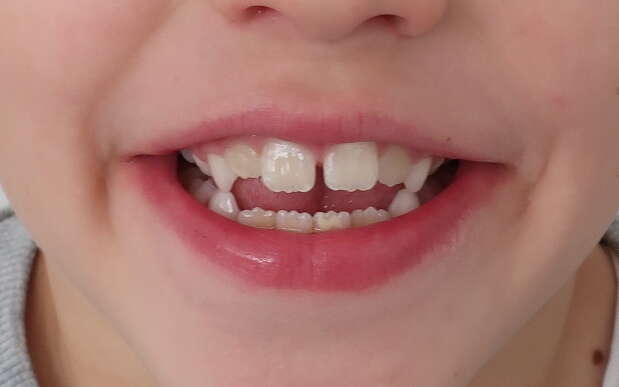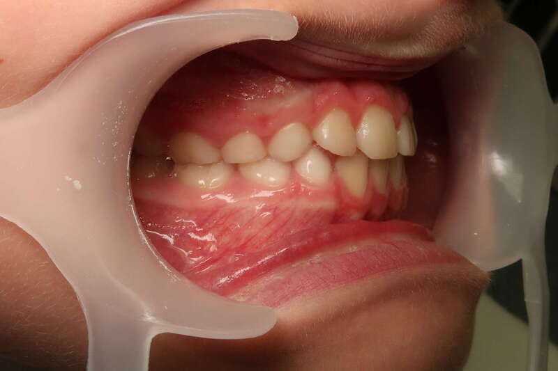 Photos "Avant" : « Proversion incisive extrême avec risque traumatique imminent. L'interposition de la lèvre inférieure sous les dents du haut aggrave le décalage et empêche une fermeture labiale sereine. »