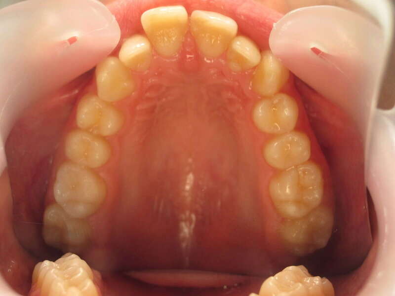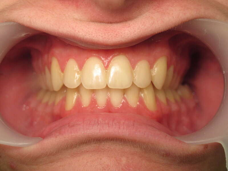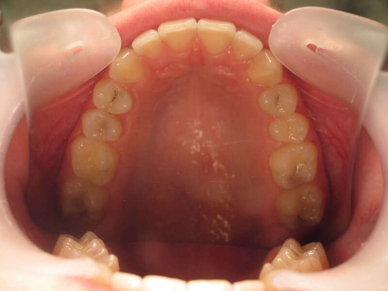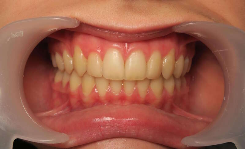 Annulation de la proalvéolie : L'espace des extractions a été utilisé pour reculer et redresser les incisives supérieures. Le surplomb est désormais physiologique.