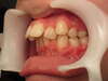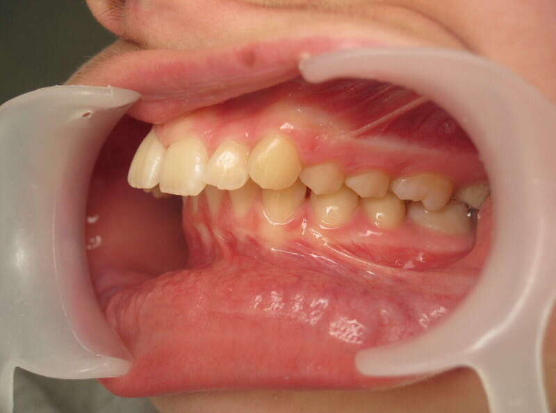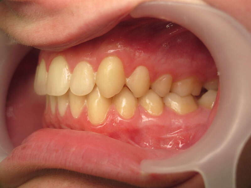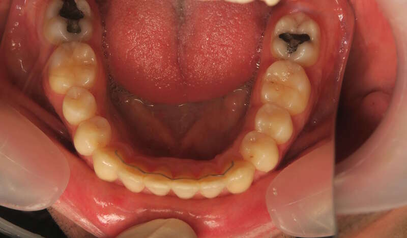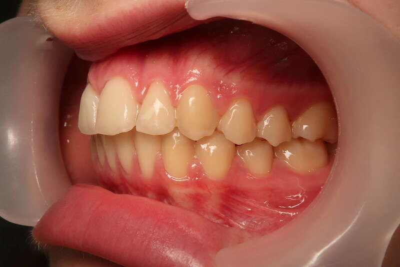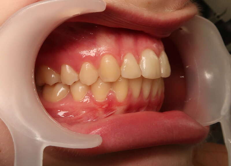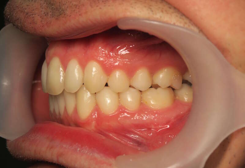 Classe II thérapeutique molaire : Le choix a été fait de terminer avec un engrènement molaire de classe II (car seules les dents du haut ont été extraites), ce qui permet une occlusion stable et parfaitement fonctionnelle.