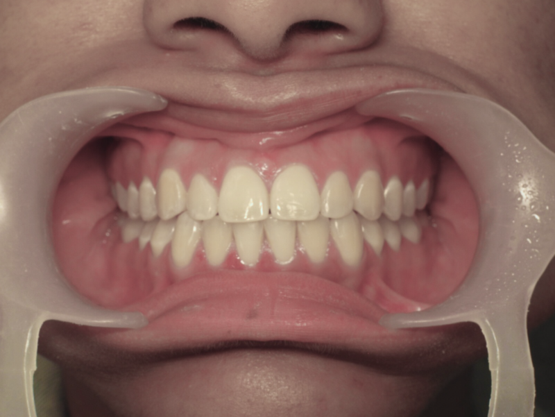 Photos "Après" : « Résultat final montrant un alignement parfait et un engrènement de Classe I. Ce succès est le fruit d'une excellente coopération de l'adolescente dans le port de ses élastiques de coordination. ».